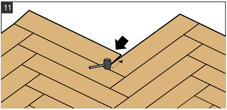 Тщательно проверяйте стыки между плашками на отсутствие зазоров после добавления каждой следующей. При необходимости подбивайте плашки при помощи киянки и подбойника. Работайте по направлению от угла к концу плашки по короткой стороне (рис. 11).