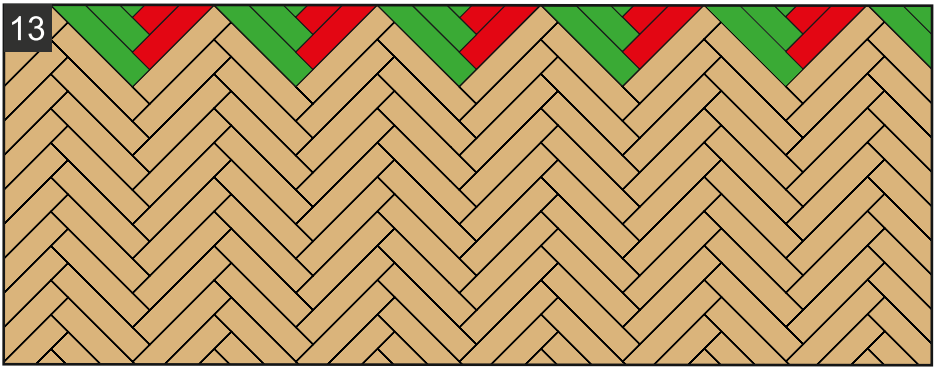 13.3. Используйте оставшиеся части плашек от стартовых треугольников для монтажа открытых частей пола в конце укладки вдоль стены (рис. 13).